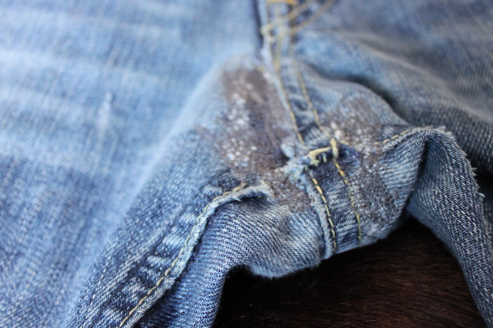 För att laga dessa favoritjeans fick jag först klippa rent allt tufsigt jeanstyg, skarva in en bit annat jeanstyg och sy med trestegs-sicksacken för att liksom fästa till kanterna. Nu hade jag inget ljust jeanstyg kvar annars brukar alltid ta tillvara bitar av slitna kasserade jeans för att använda just vid lappning.